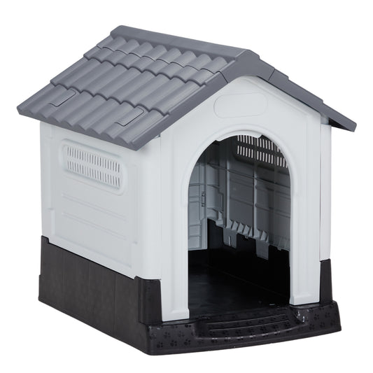 26" Waterproof Plastic Dog House - Indoor & Outdoor Pet Shelter with Air Vents & Elevated Floor in Gray & White