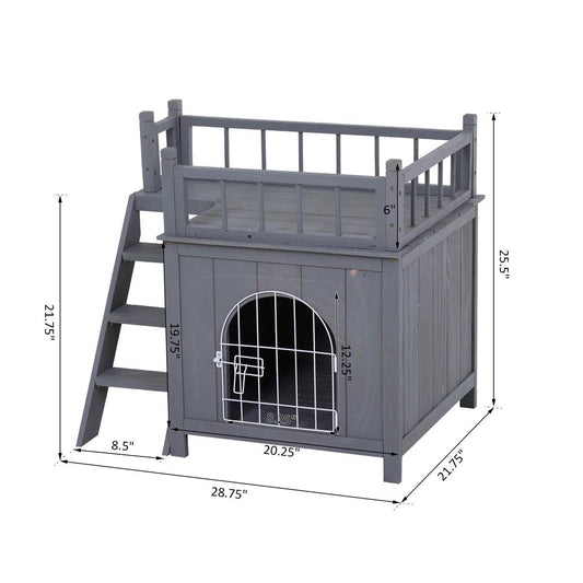 Grey Wooden Cat House - 2-Level Design with Lockable Wire Door for Ultimate Comfort