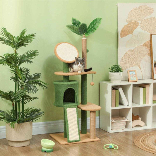 Stylish Cat Tree with Scratching Posts, Platforms, Toys & Plush Comfort – Furniture Protector with Decorative Artificial Leaves